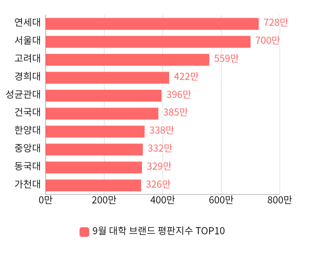 올해 8월 11일부터 9월 11일까지의 브랜드 빅데이터 분석 결과 1위는 연세대학교, 2위 서울대학교, 3위 고려대학교, 4위 경희대학교, 5위 성균관 대학교, 6위 건국대학교, 7위 한양대학교, 8위 중앙대학교, 9위 동국대학교, 10위 가천대학교 순으로 분석 됐습니다.
